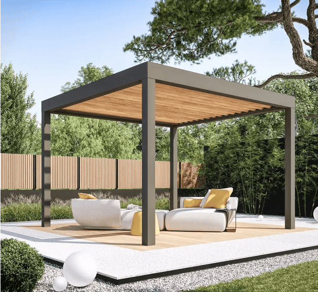 La pergola Lily conjugue esthétisme et fonctionnalité pour vous protéger du soleil, du vent, de la pluie et du vis-à-vis. En connexion directe avec la maison ou en îlot autoporté, toit plein ou toit bioclimatique, 300 coloris dont 25 best-seller au choix, elle s’adapte parfaitement à vos mesures.